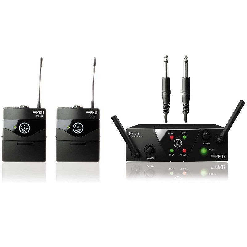 Each of the two included PT40 pocket transmitters provides a professional 3-pin mini-XLR connector that is also compatible with AKG's MicroMics from line to mic level. The WMS40 is a fixed-frequency system and the receiver has two 1/4" output connectors. Two MKG L-instrument cables and a universal power supply are also included.