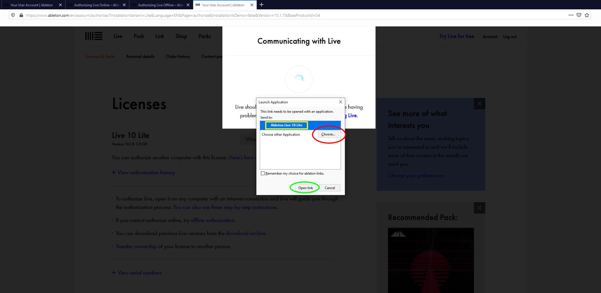 - Hộp thoại “Launch Application” sẽ hiện lên, trong đó bạn chọ nút “Choose” để tạo đường dẫn tới địa chỉ application bạn mới cài Ableton trên ổ cứng (ví dụ: C:\Program Files\Ableton\Live 10 Lite\Program\Ableton Live 10 Lite). Sau khi chọn đường dẫn thì nhấn nút “Open link”