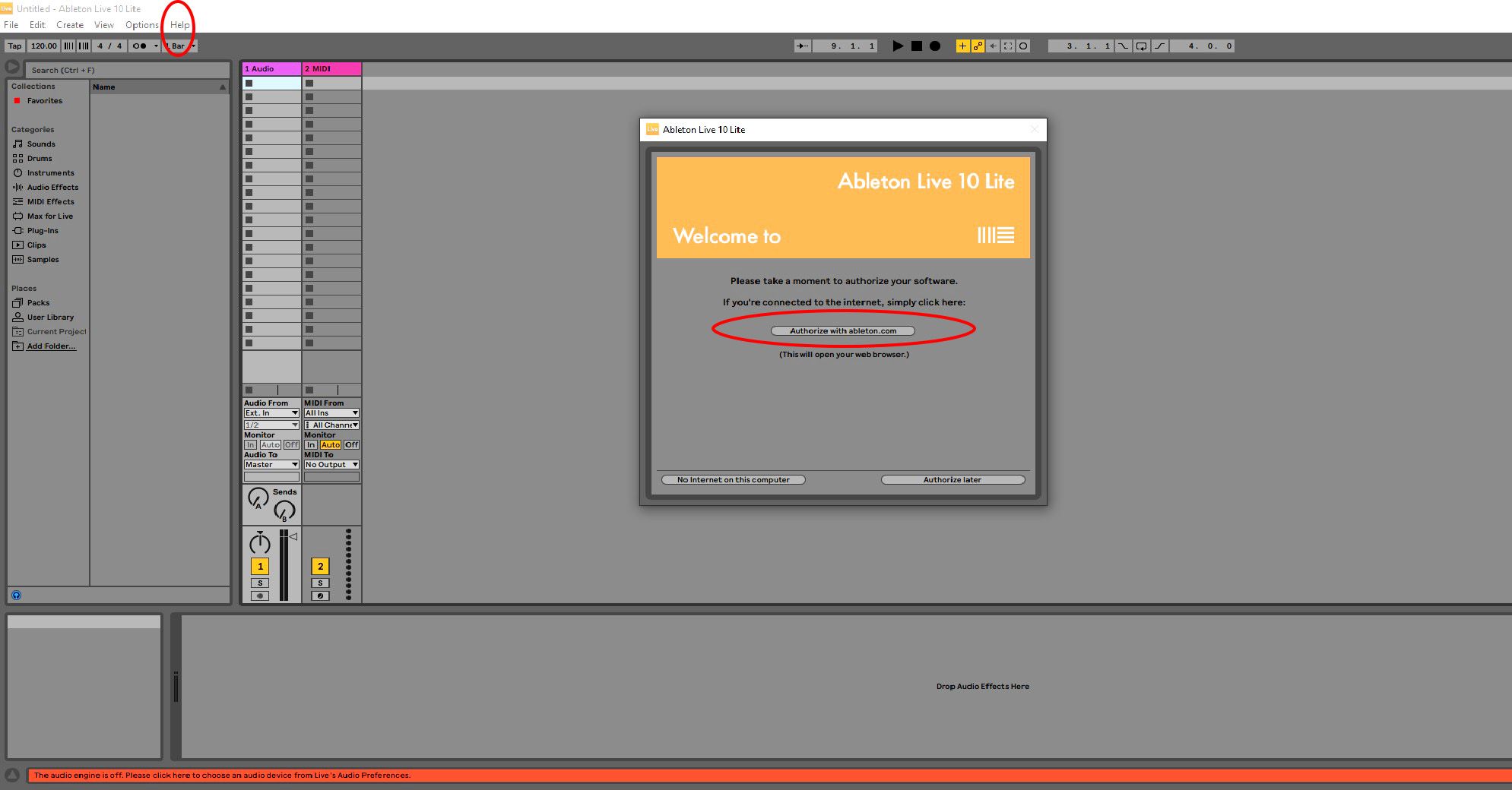 - Sau khi tạo tài khoản xong, bạn vào lại phần mềm, chọn tab “Help” rồi tab “User account and license”. bạn nhấn nút “Authorize with ableton.com”