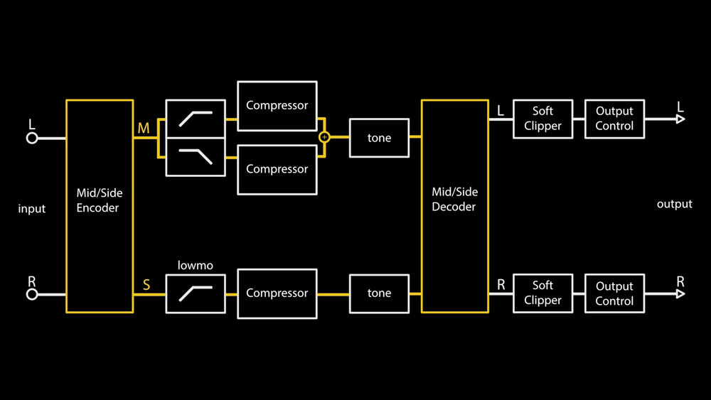 At its core, the xmax uses a proprietary analog signal path that encodes the stereo signal into Mid and Side components for independent processing. The Mid channel is further divided into Low and Mid frequency bands, allowing for three dedicated compression paths. After processing, the signal is decoded back to stereo, followed by analog sweetening via a high-shelf filter, soft clipper, and output gain stage.