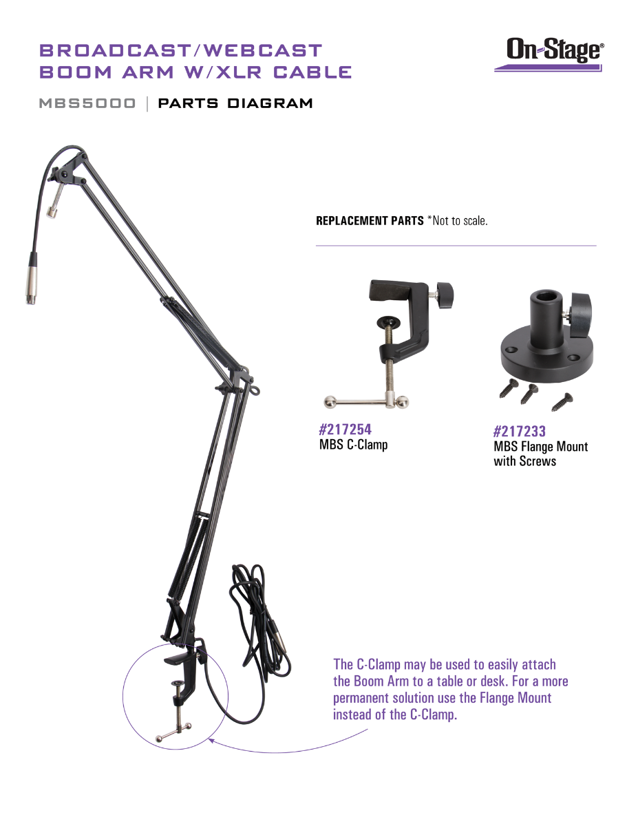 The MBS5000 is a professional articulating mic boom intended for broadcast and webcast applications. Two pairs of springs provide just the right counterbalance for popular broadcast microphones or other devices weighing up to 3.5 lbs. Designed for the studio environment, the MBS5000 allows for quiet, easy, and repeatable positioning, even while on-air. Square-tubing construction ensures strength and a long service life. A 10' XLR cable is pre-installed within the tubing for a clean look. A stem with standard 5/8-27 threading mates with all common mic clips and offers plenty of room for oversized shockmounts. Additionally, the MBS5000 comes with two mounting options. One is a removable C-clamp capable of grasping desktops and other surfaces up to 2" thick. The other is a screw-in flange mount for permanent desktop or overhead installations.