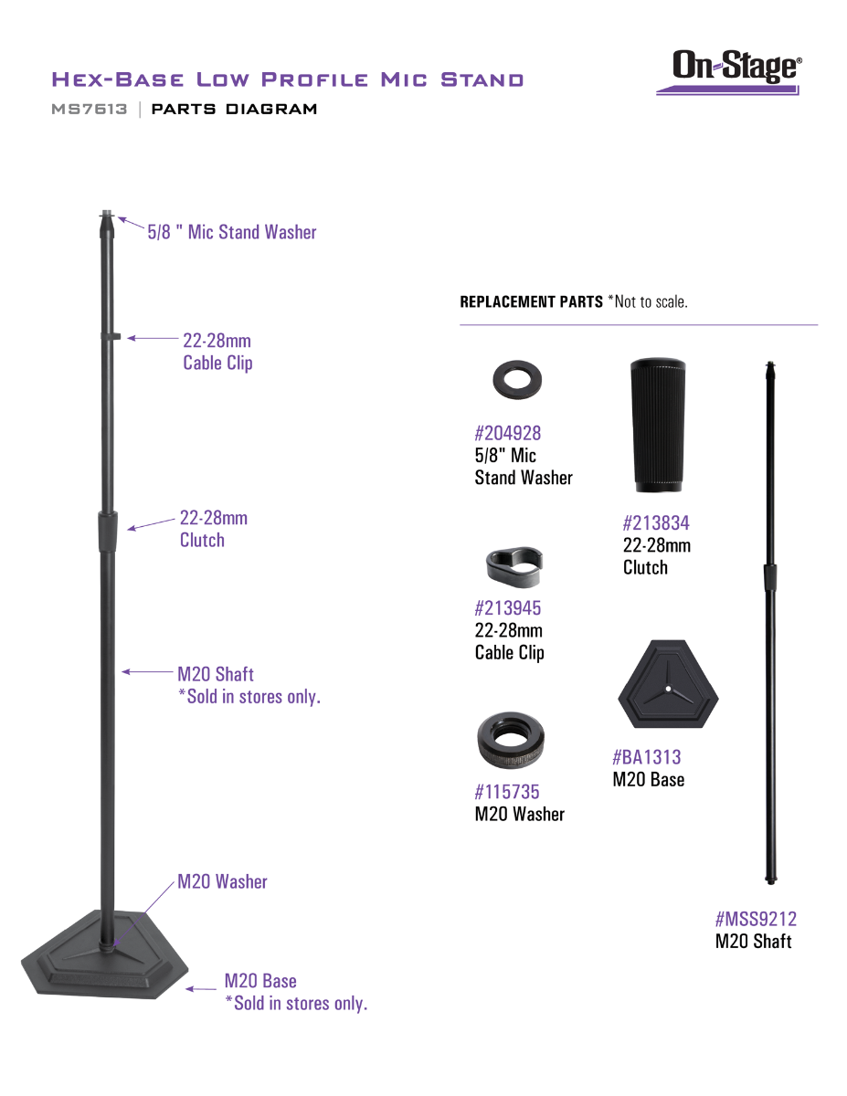 Designed specifically for tight-spaced, "in between" applications, the MS7613 features a compact 13 lb. cast iron embossed hex base complete with standard M20 threading, 1-3/8" locking washer and 6 no-slip rubber feet. The 7/8" - 1-1/8" steel tubing deploys a die-cast zinc clutch with 3" grip and over sized knurled locking washer for precise, secure height adjustment and standard 5/8" - 27 threading for mic and accessory clip accommodation. Streamlined and super stable, the feature-laden MS7613 keeps a low profile while delivering high performance.