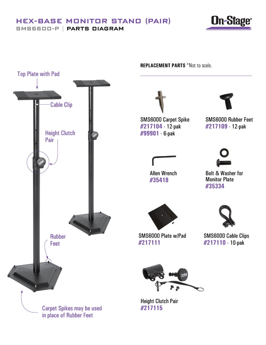 Professional Studio Monitor Stands adjust from 36.5-54" in height to customize your listening area. The stands feature a heavy duty stamped Hex-Base, which provides a stable foundation and can hold up to 90 lbs per stand. Rubber feet and EVA rubber on the platform add stability and shock absorption. Six leveling carpet spikes can be installed for extra stability when using the stand on carpet.