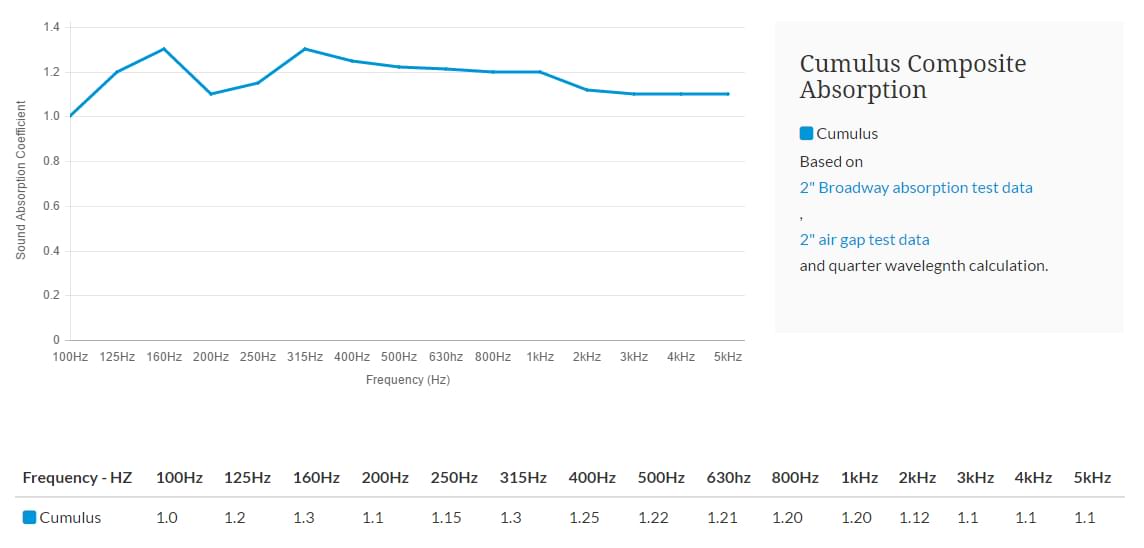 Another important aspect to the Cumulus is the quality of the acoustic material. Most folks do not realize that the density of the material plays a critical role in how well sound will be absorbed. In acoustics, we do not want to simply absorb high frequencies, but ultimately would like to absorb all frequencies evenly.